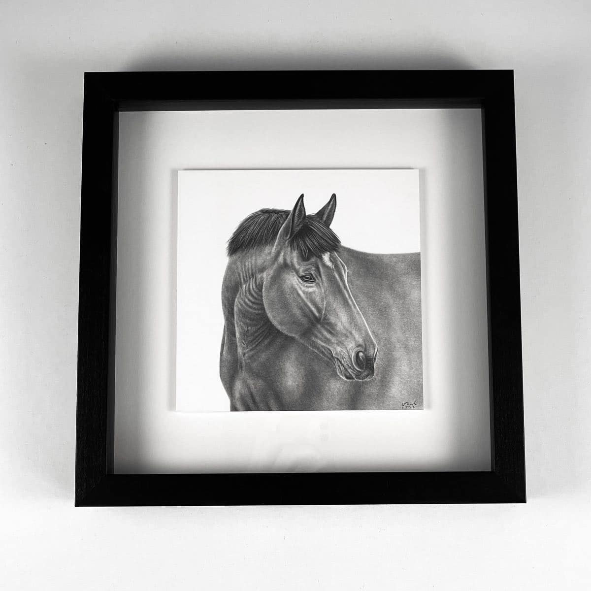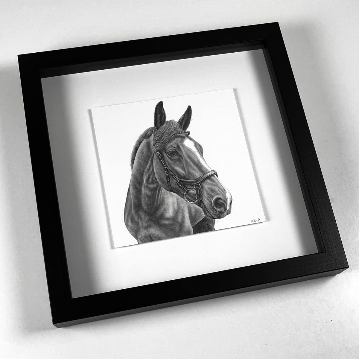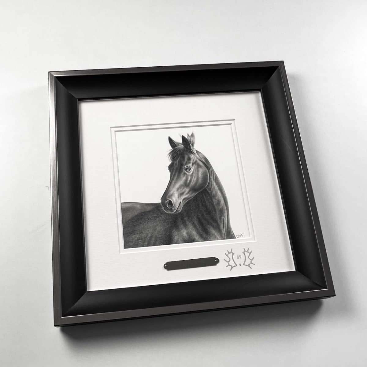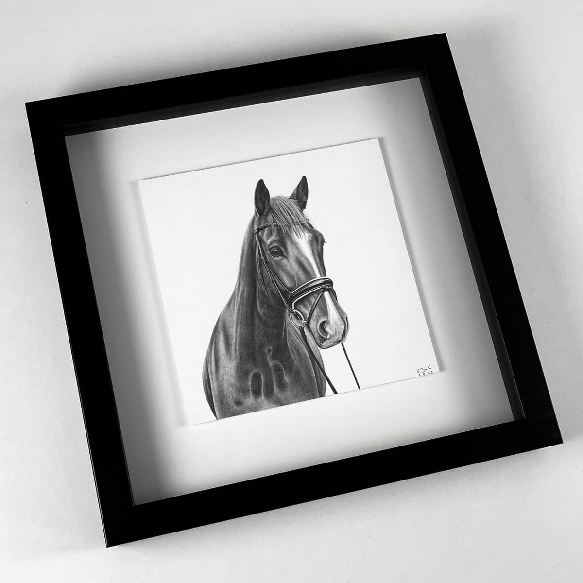 Die 15 x 15 cm Bleistiftzeichnung wird wahlweise mit einem weißen oder schwarzen Rahmen komplementiert. Das Außenformat mit Rahmen beträgt 28 x 28 cm.