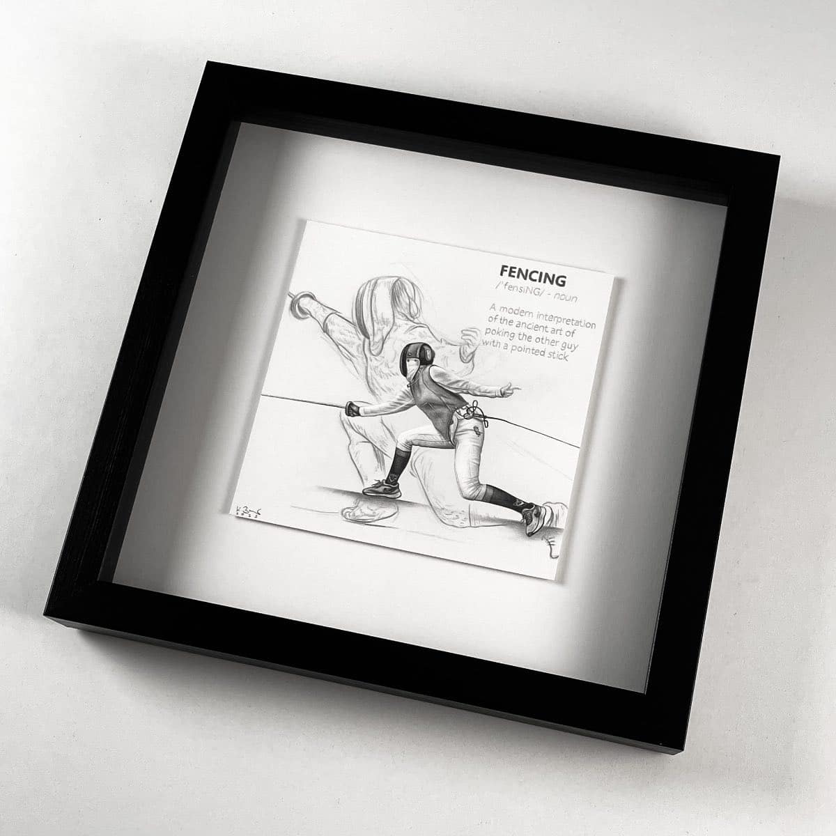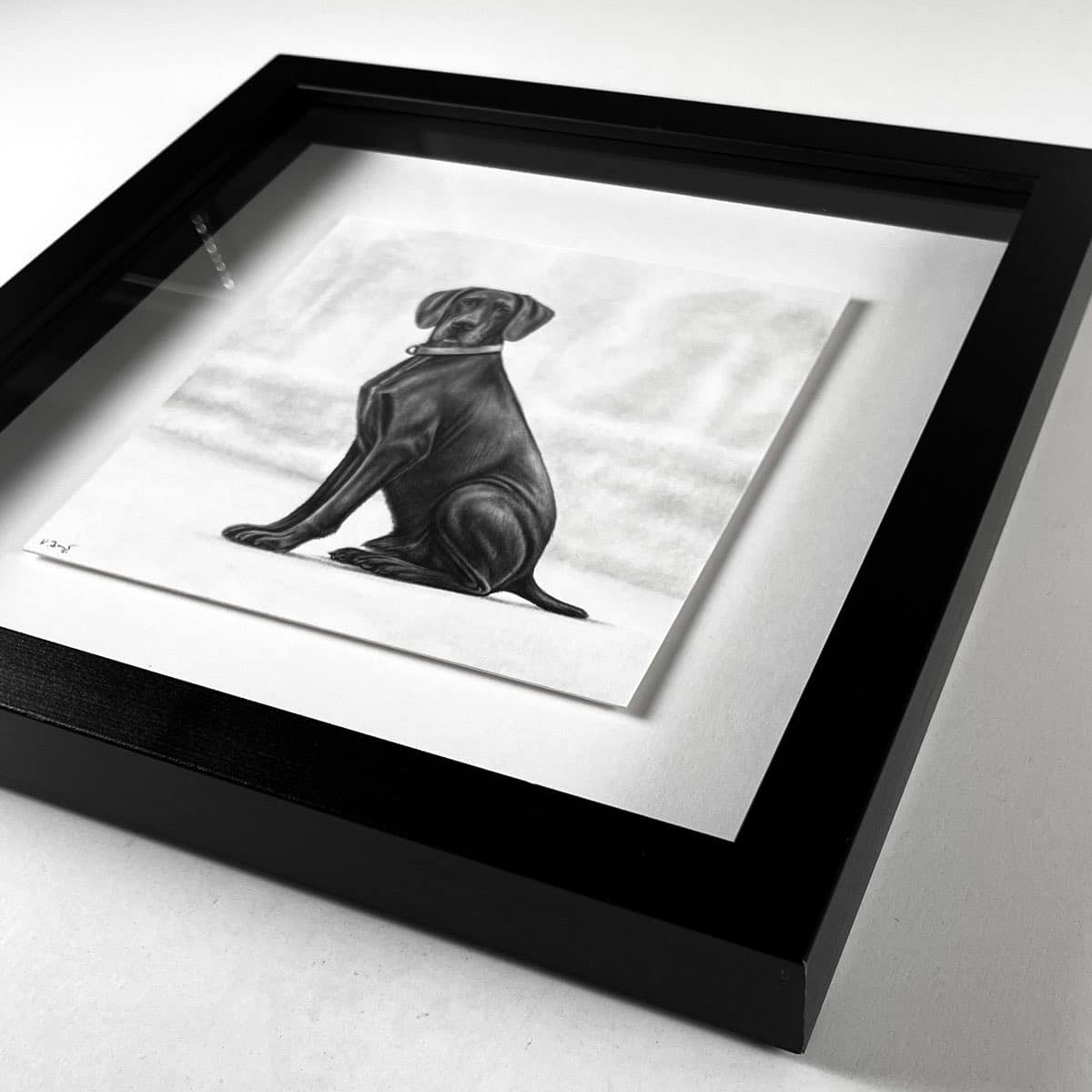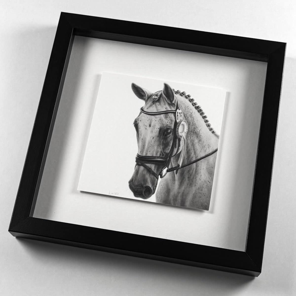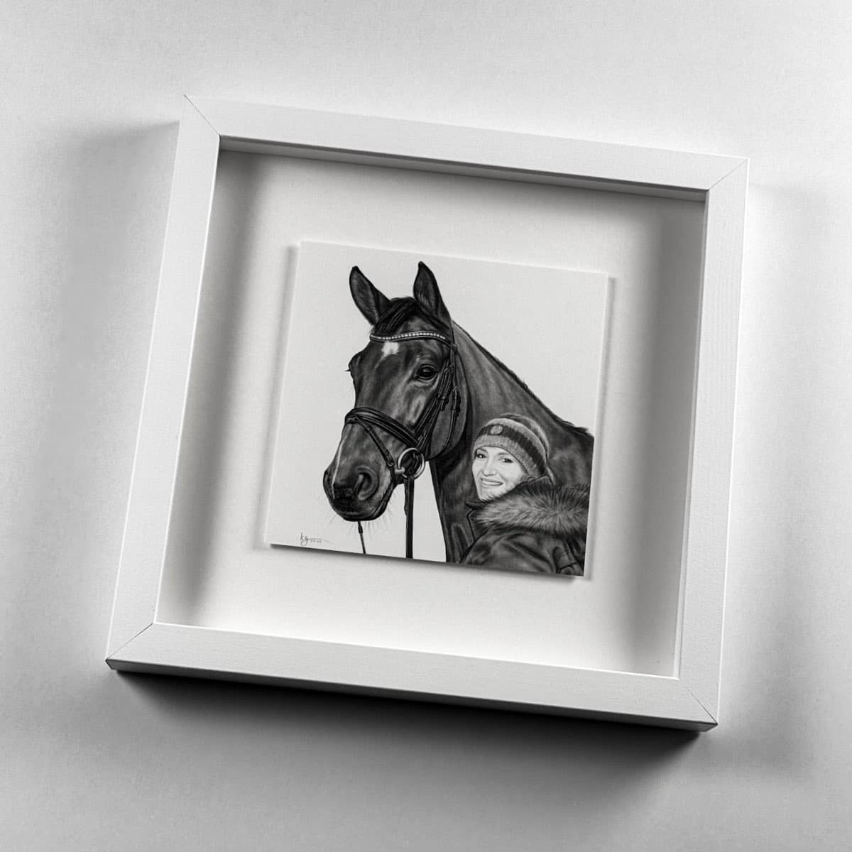 Die 15 x 15 cm Bleistiftzeichnung wird wahlweise mit einem weißen oder schwarzen Rahmen komplementiert. Das Außenformat mit Rahmen beträgt 28 x 28 cm.